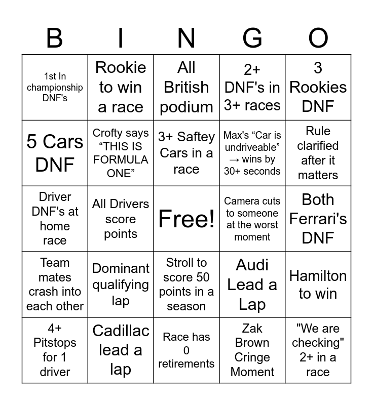 This bingo card has a free space and 66 words: Haas On Podium, Max 3+ Wins in a row, Red Bull Driver Change, Hamilton to win, George Wins a race, Williams on Podium, Rookie to win a race, 2+ Red flags in a race, 3+ Saftey Cars in a race, Piastri perfect weekend, Stroll to score 50 points in a season, 2+ pitlane starts in a race, Both Ferrari's DNF, 3 Rookies DNF, 5 Driver grid penalty's, 5 Cars DNF, All Drivers score points, 1st In championship DNF's, Driver makes up 10 places from grid position, Max's “Car is undriveable” → wins by 30+ seconds, Dominant qualifying lap, Team mates crash into each other, 2+ DNF's in 3+ races, Safety car in the first 5 laps, Alpine Speeding in Pitlane, Awkward brundle gridwalk moment, Delayed Race because of Rain, Engineer and Driver Argument, "We are checking" 2+ in a race, "Box box" followed by "Stay out", 4+ Pitstops for 1 driver, Alonso holding up 5+ drivers, Stroll crashing 4+ times, Alpine Lead a Lap, Audi Lead a Lap, Cadillac lead a lap, Perez to qualify P6 and above, Driver DNF's at home race, Zak Brown Cringe Moment, Toto "Crashing out", Crofty says “THIS IS FORMULA ONE”, Commentators jinx a driver immediately, Camera cuts to someone at the worst moment, Driver interviewed while clearly furious, “Leave me alone” on radio, Accidental hot mic moment, Rule clarified after it matters, Safety Car for something tiny, Stroll radio: “What happened?”, Virtual Safety Car confusion, 1-2 any team, Spin, crash or collision under safety car, Rain is forecast but doesn't happen, Animal on track, Less than 1 second between podium finishers, Substitute driver (in race), 2 or more red flags in qualy, Wets and Dry's used in Quali, All British podium, Race has 0 retirements, Race does not go full distance, Race ends under safety car or VSC, Penalty for not serving a penalty correctly, Pitlane crash or collision, Sprint and GP have same winners and Race does not start on time.
