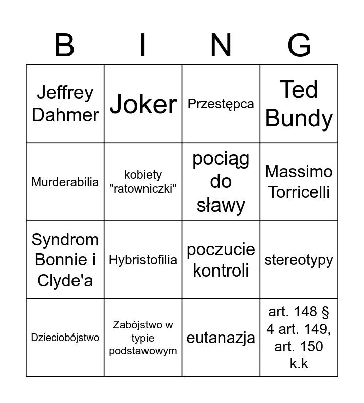 This bingo card has 16 words: Zabójstwo w typie podstawowym, stereotypy, Przestępca, Jeffrey Dahmer, Syndrom Bonnie i Clyde'a, Joker, poczucie kontroli, eutanazja, Murderabilia, kobiety "ratowniczki", Dzieciobójstwo, Ted Bundy, Hybristofilia, Massimo Torricelli, pociąg do sławy and art. 148 § 4 art. 149, art. 150 k.k.