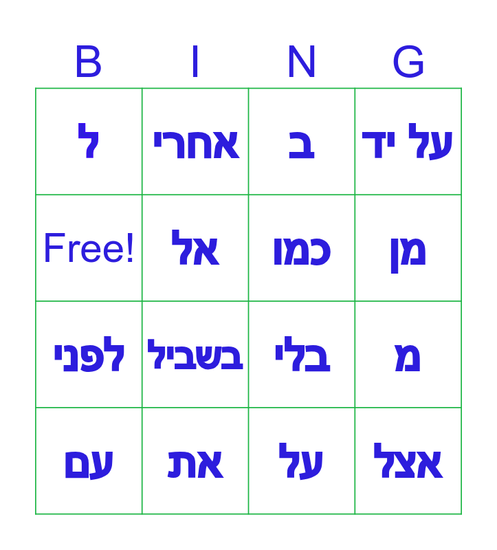 This bingo card has 16 words: את, מ, ב, ל, לפני, אחרי, בלי, על, Free!, אל, עם, על יד, בשביל, מן, כמו and אצל.