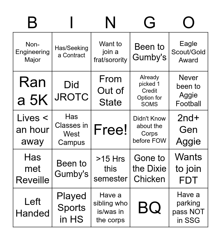 This bingo card has a free space and 24 words: Been to Gumby's, Played Sports in HS, From Out of State, Left Handed, Eagle Scout/Gold Award, Non-Engineering Major, Ran a 5K, Has/Seeking a Contract, Didn't Know about the Corps before FOW, >15 Hrs this semester, Already picked 1 Credit Option for SOMS, Lives < an hour away, Gone to the Dixie Chicken, Wants to join FDT, Did JROTC, BQ, 2nd+ Gen Aggie, Want to join a frat/sorority, Never been to Aggie Football, Has Classes in West Campus, Have a parking pass NOT in SSG, Has met Reveille, Been to Gumby's and Have a sibling who is/was in the corps.