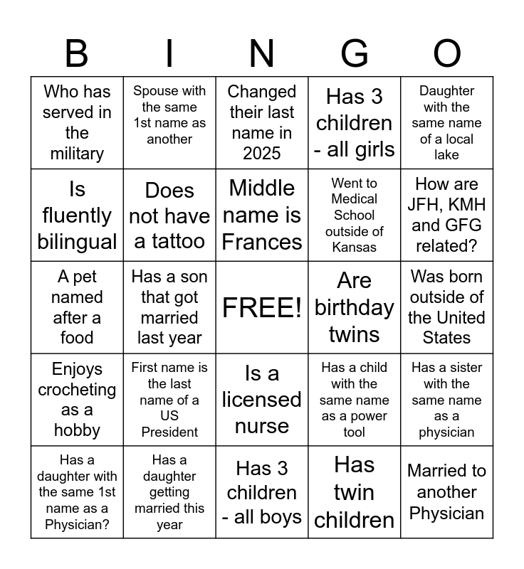 This bingo card has a free space and 24 words: Has a daughter with the same 1st name as a Physician?, First name is the last name of a US President, Middle name is Frances, Has twin children, Daughter with the same name of a local lake, Who has served in the military, Spouse with the same 1st name as another, Changed their last name in 2025, Are birthday twins, Was born outside of the United States, A pet named after a food, Does not have a tattoo, Has a child with the same name as a power tool, Has a sister with the same name as a physician, Is fluently bilingual, Has a daughter getting married this year, Has 3 children - all boys, Has 3 children - all girls, How are JFH, KMH and GFG related?, Enjoys crocheting as a hobby, Has a son that got married last year, Is a licensed nurse, Went to Medical School outside of Kansas and Married to another Physician.