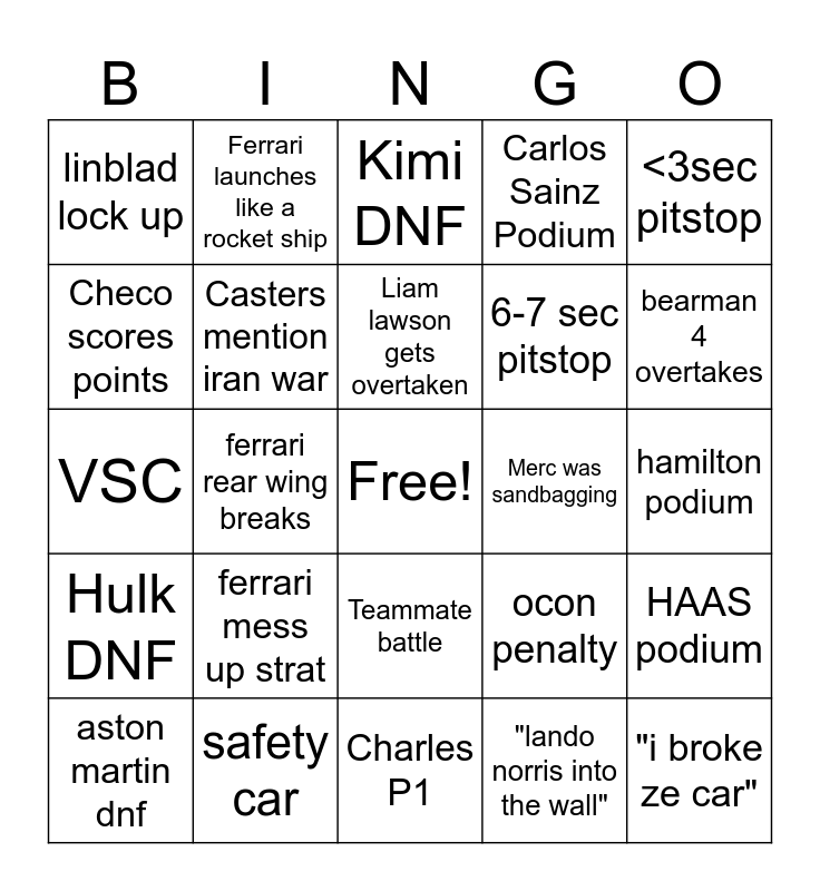 This bingo card has a free space and 24 words: ferrari mess up strat, safety car, Liam lawson gets overtaken, aston martin dnf, <3sec pitstop, linblad lock up, Checo scores points, Ferrari launches like a rocket ship, Merc was sandbagging, Teammate battle, 6-7 sec pitstop, VSC, ocon penalty, HAAS podium, Casters mention iran war, "lando norris into the wall", hamilton podium, Kimi DNF, bearman 4 overtakes, ferrari rear wing breaks, "i broke ze car", Hulk DNF, Carlos Sainz Podium and Charles P1.