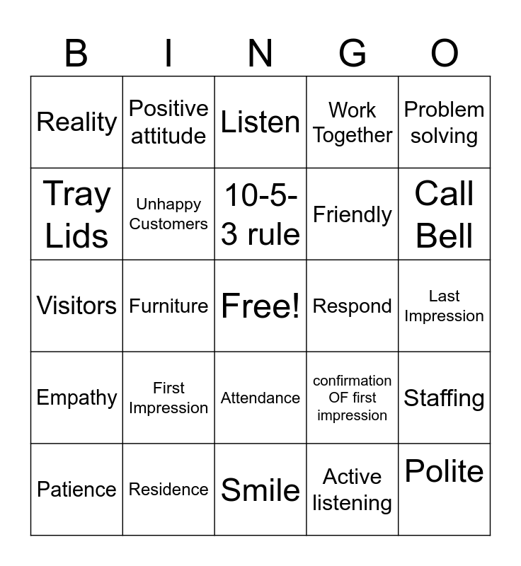 This bingo card has a free space and 34 words: Communication, Active listening, Inconsistent, Negative Reviews, Empathy, Unhappy Customers, Problem solving, Patience, Positive attitude, Customer Service, 10-5-3 rule, Listen, Empathize, Apologize, Respond, Call Bell, Residence, Visitors, First Impression, confirmation OF first impression, Attendance, EXPECTATION, Reality, Last Impression, Smile, Polite, Work Together, Teamwork, Friendly, Tray Lids, Dirty Carts, Furniture, Staffing and uniform.