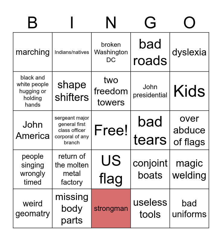 This bingo card has a free space and 24 words: return of the molten metal factory, missing body parts, two freedom towers, weird geomatry, dyslexia, marching, black and white people hugging or holding hands, Indians/natives, bad tears, US flag, John presidential, John America, conjoint boats, magic welding, shape shifters, useless tools, over abduce of flags, broken Washington DC, Kids, sergeant major general first class officer corporal of any branch, bad uniforms, people singing wrongly timed, bad roads and strongman.