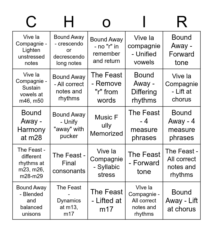 This bingo card has a free space and 24 words: The Feast - Final consonants, The Feast - Dynamics at m13, m17, The Feast - Remove "r" from words, Bound Away - Blended and balanced unisons, Bound Away - Forward tone, Vive la Compagnie - Lighten unstressed notes, Vive la Compagnie - Sustain vowels at m46, m50, Bound Away - crescendo or decrescendo long notes, The Feast - 4 measure phrases, Vive la Compagnie - Syllabic stress, Bound Away - Differing rhythms, Bound Away - Harmony at m28, The Feast - Forward tone, The Feast - All correct notes and rhythms, Bound Away - All correct notes and rhythms, VIve la Compagnie - All correct notes and rhythms, Bound Away - 4 measure phrases, Bound Away - no "r" in remember and return, Vive la Compagnie - Lift at chorus, Bound Away - Unify "away" with pucker, Bound Away - Lift at chorus, The Feast - different rhythms at m23, m26, m28-m29, Vive la compagnie - Unified vowels and The Feast - Lifted at m17.
