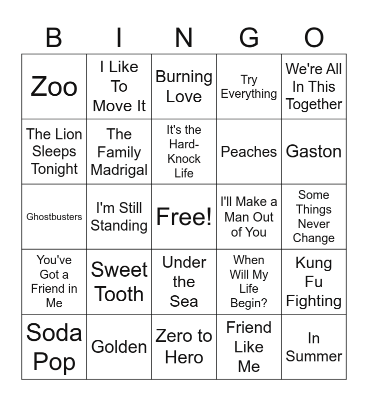 This bingo card has a free space and 30 words: Golden, Popular, I'm Still Standing, You're Welcome, Zoo, Burning Love, The Family Madrigal, Under the Sea, I'll Make a Man Out of You, Zero to Hero, Some Things Never Change, In Summer, Friend Like Me, Remember Me, Gaston, The Muppet Show Theme, When Will My Life Begin?, You've Got a Friend in Me, Sweet Tooth, We're All In This Together, Ghostbusters, Everything is AWESOME, I Like To Move It, Peaches, The Lion Sleeps Tonight, Try Everything, Kung Fu Fighting, Soda Pop, It's the Hard-Knock Life and Y.M.C.A..