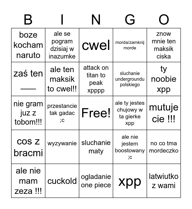 This bingo card has a free space and 24 words: ale nie mam zeza !!!, wyzywanie, attack on titan to peak xpppp, xpp, znow mnie ten maksik ciska, boze kocham naruto, ale se pogram dzisiaj w inazumke, cwel, ale ty jestes chujowy w ta gierke xpp, mutuje cie !!!, nie gram juz z tobom!!!, ale ten maksik to cwel!!, ale nie jestem boostowany ;c, no co tma mordeczko, zaś ten ___, cuckold, ogladanie one piece, morda/zamknij morde, ty noobie xpp, cos z bracmi, przestancie tak gadac ;c, sluchanie maty, sluchanie undergroundu polskiego and latwiutko z wami.