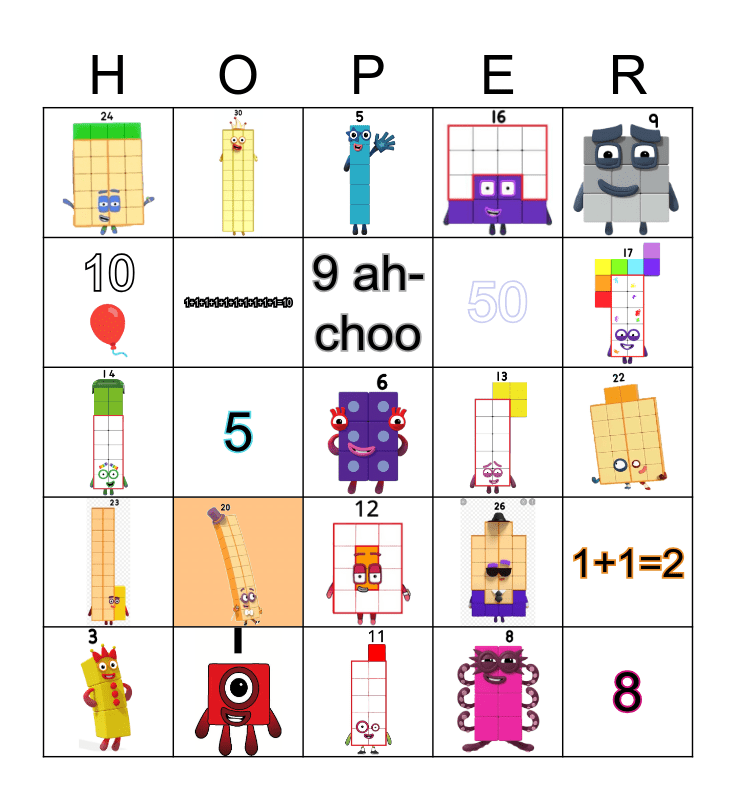 This bingo card has 30 images and 15 words: 1, 1+1=2, 2, 3, 4, 5, 6🎲, 7🏳️🌈🌈, 8, 9 ah-choo, 10🎈, 50, 100, 1+1+1+1+1+1+1+1+1+1=10 and 3🍎🍏.