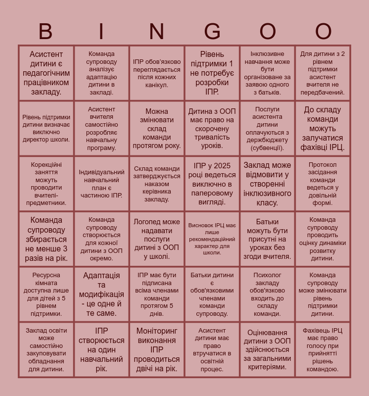This bingo card has 36 words: Батьки дитини є обов'язковими членами команди супроводу., ІПР має бути підписана всіма членами команди протягом 5 днів., Асистент дитини має право втручатися в освітній процес., Рівень підтримки дитини визначає виключно директор школи., Команда супроводу збирається не менше 3 разів на рік., ІПР у 2025 році ведеться виключно в паперовому вигляді., Асистент вчителя самостійно розробляє навчальну програму., Моніторинг виконання ІПР проводиться двічі на рік., Інклюзивне навчання може бути організоване за заявою одного з батьків., Психолог закладу обов'язково входить до складу команди., До складу команди можуть залучатися фахівці ІРЦ., Рівень підтримки 1 не потребує розробки ІПР., Команда супроводу може змінювати рівень підтримки дитини., Індивідуальний навчальний план є частиною ІПР., Дитина з ООП має право на скорочену тривалість уроків., Асистент дитини є педагогічним працівником закладу., Ресурсна кімната доступна лише для дітей з 5 рівнем підтримки., Заклад може відмовити у створенні інклюзивного класу., Корекційні заняття можуть проводити вчителі-предметники., ІПР обов’язково переглядається після кожних канікул., Склад команди затверджується наказом керівника закладу., Команда супроводу створюється для кожної дитини з ООП окремо., Висновок ІРЦ має лише рекомендаційний характер для школи., Логопед може надавати послуги дитині з ООП у школі., Батьки можуть бути присутні на уроках без згоди вчителя., Команда супроводу аналізує адаптацію дитини в закладі., Послуги асистента дитини оплачуються з держбюджету (субвенції)., ІПР створюється на один навчальний рік., Можна змінювати склад команди протягом року., Для дитини з 2 рівнем підтримки асистент вчителя не передбачений., Фахівець ІРЦ має право голосу при прийнятті рішень командою., Заклад освіти може самостійно закуповувати обладнання для дитини., Команда супроводу проводить оцінку динаміки розвитку дитини., Протокол засідання команди ведеться у довільній формі., Адаптація та модифікація - це одне й те саме. and Оцінювання дитини з ООП здійснюється за загальними критеріями..