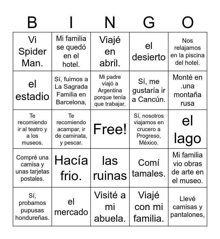 This bingo card has a free space and 26 words: Fui a Costa Rica, Hacía frio., Visité a mi abuela., Viajé con mi familia., Monté en .una montaña rusa, Vi Spider Man., Mi familia se quedó en el hotel., Viajé en abril., Sí, me gustaría ir a Cancún., Mi familia vio obras de arte en el museo., Te recomiendo ir al teatro y a los museos., Te recomiendo acampar, ir de caminata, y pescar., Comí tamales., Llevé camisas y pantalones,, Compré una camisa y unas tarjetas postales., Puedes construir un castillo de arena y nadar en el mar., Mi padre viajó a Argentina porque tenía que trabajar., Sí, nosotros viajamos en crucero a Progreso, México., Nos relajamos en la piscina del hotel., Sí, probamos pupusas hondureñas., Sí, fuimos a La Sagrada Familia en Barcelona,, las ruinas, el desierto, el lago, el estadio and el mercado.