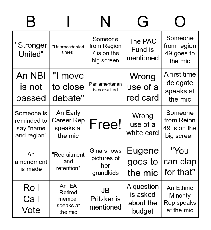 This bingo card has a free space and 28 words: "You can clap for that", Wrong use of a green card, Wrong use of a red card, A question is asked about the budget, An NBI is not passed, Someone from Region 7 is on the big screen, "Unprecedented times", An amendment is made, Wrong use of a white card, Roll Call Vote, Someone is reminded to say "name and region", The PAC Fund is mentioned, An IEA Retired member speaks at the mic, JB Pritzker is mentioned, A first time delegate speaks at the mic, There is a standing ovation, "Recruitment and retention", "I move to close debate", Parliamentarian is consulted, Gina shows pictures of her grandkids, "Stronger United", SCORE Grants are mentioned, An Ethnic Minority Rep speaks at the mic, An Early Career Rep speaks at the mic, Someone from Reion 49 is on the big screen, Eugene goes to the mic, Someone from region 49 goes to the mic and ESP goes to the mic.