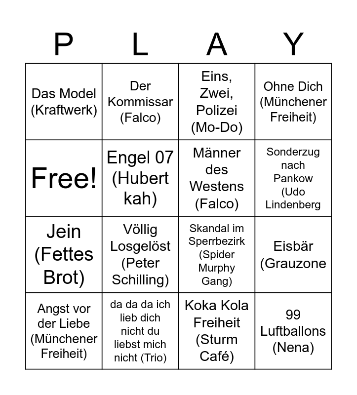 This bingo card has 16 words: da da da ich lieb dich nicht du liebst mich nicht (Trio), Eisbär (Grauzone, Eins, Zwei, Polizei (Mo-Do), Das Model (Kraftwerk), Jein (Fettes Brot), Der Kommissar (Falco), Skandal im Sperrbezirk (Spider Murphy Gang), Koka Kola Freiheit (Sturm Café), Free!, Engel 07 (Hubert kah), Angst vor der Liebe (Münchener Freiheit), Ohne Dich (Münchener Freiheit), Völlig Losgelöst (Peter Schilling), Sonderzug nach Pankow (Udo Lindenberg, Männer des Westens (Falco) and 99 Luftballons (Nena).