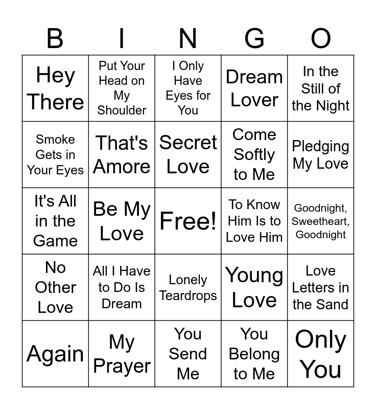 This bingo card has a free space and 50 words: Love Me Tender, Only You, Unforgettable, You Send Me, All I Have to Do Is Dream, Earth Angel, Put Your Head on My Shoulder, Chances Are, Smoke Gets in Your Eyes, Mona Lisa, That's Amore, Dream Lover, Love Letters in the Sand, Young Love, Sincerely, Because of You, Secret Love, To Know Him Is to Love Him, Since I Don't Have You, In the Still of the Night, Be My Love, You Belong to Me, Hey There, Come Softly to Me, Little Star, Tears on My Pillow, Pledging My Love, Maybe, I Only Have Eyes for You, Lonely Teardrops, Only the Lonely, It's Almost Tomorrow, Crying in the Chapel, Love and Marriage, My Prayer, I Love You Truly, My Foolish Heart, An Affair to Remember, Remember Then, Goodnight, Sweetheart, Goodnight, When I Fall in Love, I'll Be Seeing You, Too Young, All the Way, Again, It's All in the Game, Blue Velvet, Sweet Nothin’s, No Other Love and I'll Never Smile Again.