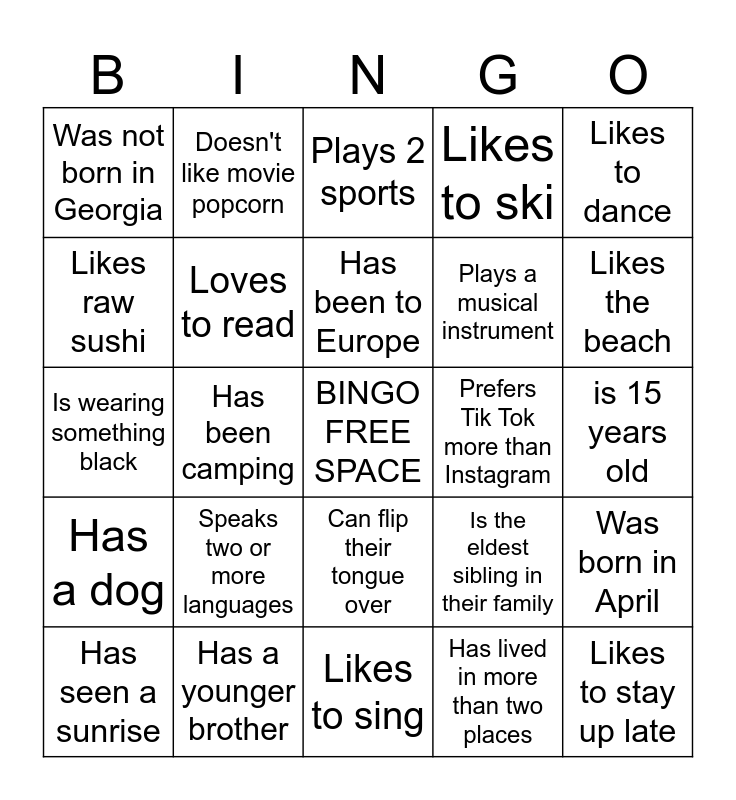 This bingo card has a free space and 29 words: Was born in October, Has a younger brother, Plays 2 sports, Is wearing white shoes, Likes to dance, Was not born in Georgia, Loves to read, Has been to Europe, Prefers Tik Tok more than Instagram, Was born in April, Has seen a sunrise, Has been camping, Has lived in more than two places, Likes to stay up late, Is wearing something black, Likes math, Likes to sing, Is the eldest sibling in their family, Likes the beach, Has a dog, Speaks two or more languages, Has an older sister, Plays a musical instrument, is 15 years old, Likes raw sushi, Doesn't like movie popcorn, Can flip their tongue over, Likes to ski and Goes running for fun.
