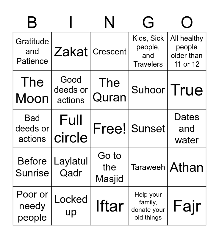 This bingo card has a free space and 27 words: Taraweeh, Eid-Ul-Fitr, Suhoor, Iftar, The Moon, Crescent, Zakat, Before Sunrise, Sunset, Athan, Bad deeds or actions, Kids, Sick people, and Travelers, Poor or needy people, Locked up, True, False, Good deeds or actions, The Quran, Laylatul Qadr, Gratitude and Patience, Dates and water, Help your family, donate your old things, Full circle, Fajr, Go to the Masjid, All healthy people older than 11 or 12 and Multiplies your rewards.