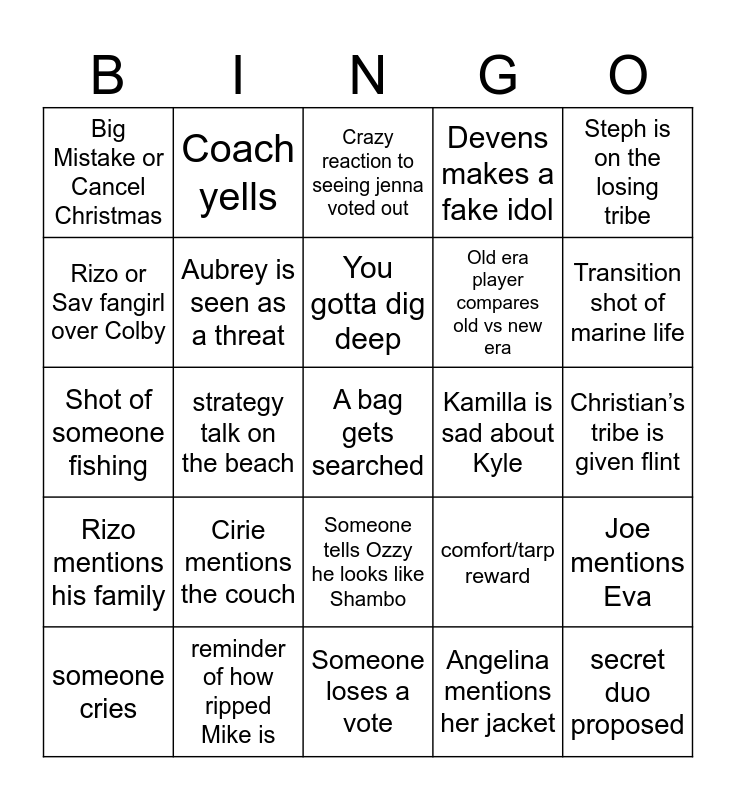 This bingo card has a free space and 24 words: Cirie mentions the couch, reminder of how ripped Mike is, You gotta dig deep, someone cries, Steph is on the losing tribe, Big Mistake or Cancel Christmas, Rizo or Sav fangirl over Colby, Coach yells, Kamilla is sad about Kyle, Someone tells Ozzy he looks like Shambo, Old era player compares old vs new era, Shot of someone fishing, comfort/tarp reward, Joe mentions Eva, Aubrey is seen as a threat, Angelina mentions her jacket, Christian’s tribe is given flint, Crazy reaction to seeing jenna voted out, Transition shot of marine life, strategy talk on the beach, secret duo proposed, Rizo mentions his family, Devens makes a fake idol and Someone loses a vote.