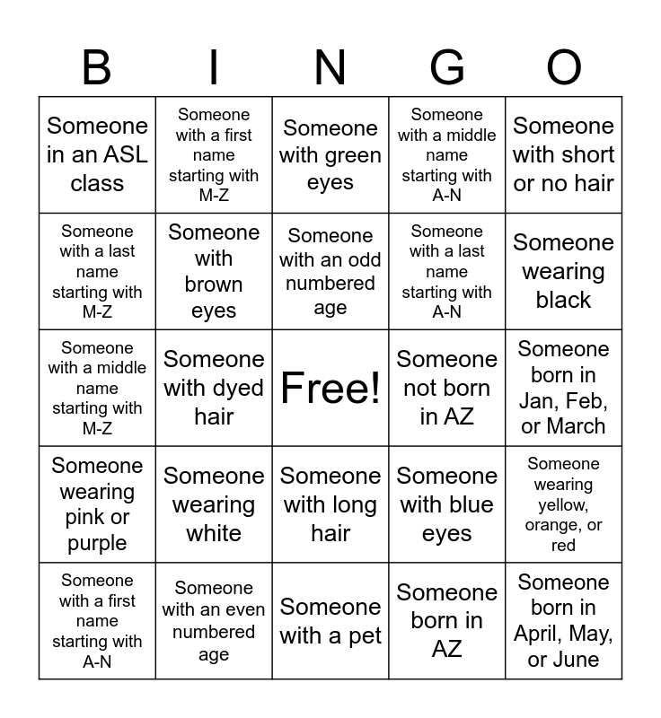 This bingo card has a free space and 31 words: Someone with a pet, Someone who has traveled out of the country, Someone with dyed hair, Someone with glasses, Someone in an ASL class, Someone with green eyes, Someone with brown eyes, Someone with blue eyes, Someone not born in AZ, Someone born in AZ, Someone born in Jan, Feb, or March, Someone born in April, May, or June, Someone born in July, Aug, or Sept, Someone born in Oct, Nov, or Dec, Someone wearing black, Someone wearing green or blue, Someone wearing yellow, orange, or red, Someone wearing white, Someone wearing pink or purple, Someone with long hair, Someone with short or no hair, Someone with a horse zodiac, or has ridden a horse, Someone with a first name starting with A-N, Someone with a first name starting with M-Z, Someone with a last name starting with A-N, Someone with a last name starting with M-Z, Someone with a middle name starting with A-N, Someone with a middle name starting with M-Z, Someone with an even numbered age, Someone with an odd numbered age and Someone who knows a language other than English or ASL.