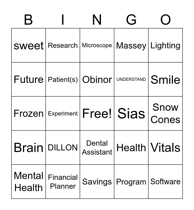 This bingo card has a free space and 24 words: DILLON, Financial Planner, Obinor, Mental Health, Lighting, sweet, Future, Research, Sias, Dental Assistant, UNDERSTAND, Frozen, Health, Vitals, Patient(s), Program, Snow Cones, Microscope, Smile, Experiment, Software, Brain, Massey and Savings.