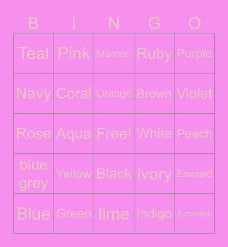 This bingo card has a free space and 24 words: Yellow, Green, Orange, Blue, Purple, Teal, Navy, Pink, White, Black, Brown, Rose, Ivory, Emerald, Coral, Indigo, Peach, Maroon, Violet, Aqua, Turquoise, blue grey, Ruby and lime.