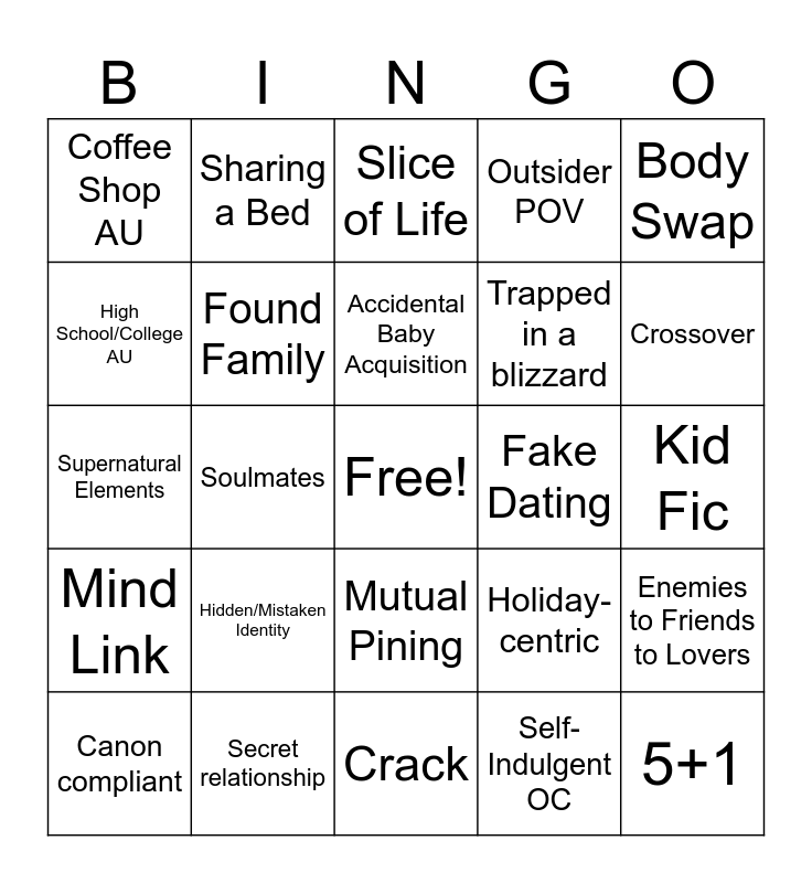 This bingo card has a free space and 24 words: Hidden/Mistaken Identity, Secret relationship, Accidental Baby Acquisition, Canon compliant, Body Swap, Coffee Shop AU, High School/College AU, Sharing a Bed, Fake Dating, Mutual Pining, Trapped in a blizzard, Supernatural Elements, Holiday-centric, Enemies to Friends to Lovers, Found Family, Self-Indulgent OC, Kid Fic, Slice of Life, Crossover, Soulmates, 5+1, Mind Link, Outsider POV and Crack.