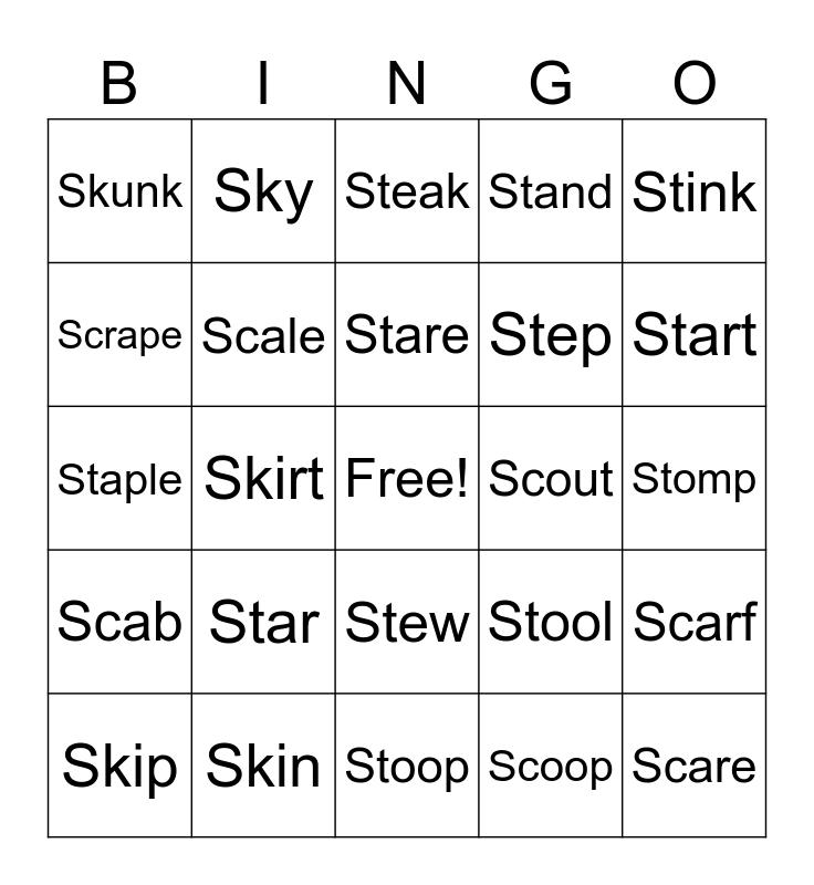 This bingo card has a free space and 24 words: Star, Skin, Stare, Skip, Stink, Skunk, Scrape, Sky, Scout, Stew, Step, Staple, Stool, Scarf, Scale, Scoop, Stomp, Steak, Start, Skirt, Scare, Scab, Stand and Stoop.