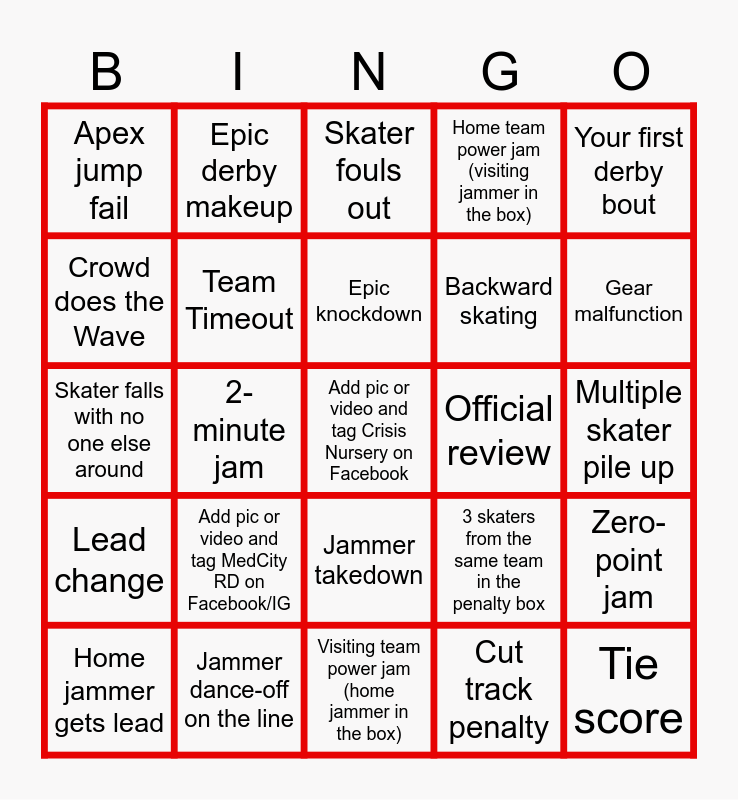 This bingo card has 36 words: Free!, Apex Jump, Whip, Team Timeout, 3 skaters from the same team in the penalty box, Lead change, Epic knockdown, Skaters dancing during timeout, Your first derby bout, Star pass, 2-minute jam, Home team power jam (visiting jammer in the box), Official timeout, Official review, Gear malfunction, Apex jump fail, Tie score, Add pic or video and tag MedCity RD on Facebook/IG, Add pic or video and tag Crisis Nursery on Facebook, Skater fouls out, Multiple skater pile up, Zero-point jam, Jammer dance-off on the line, Home jammer gets lead, Visiting team power jam (home jammer in the box), Epic derby makeup, Skater falls with no one else around, Track maintenance, Backward skating, Crowd does the Wave, Someone goes flying, Players from opposite teams hug, Cut track penalty, Jammer takedown, Coach losing cool and Skating on one foot.