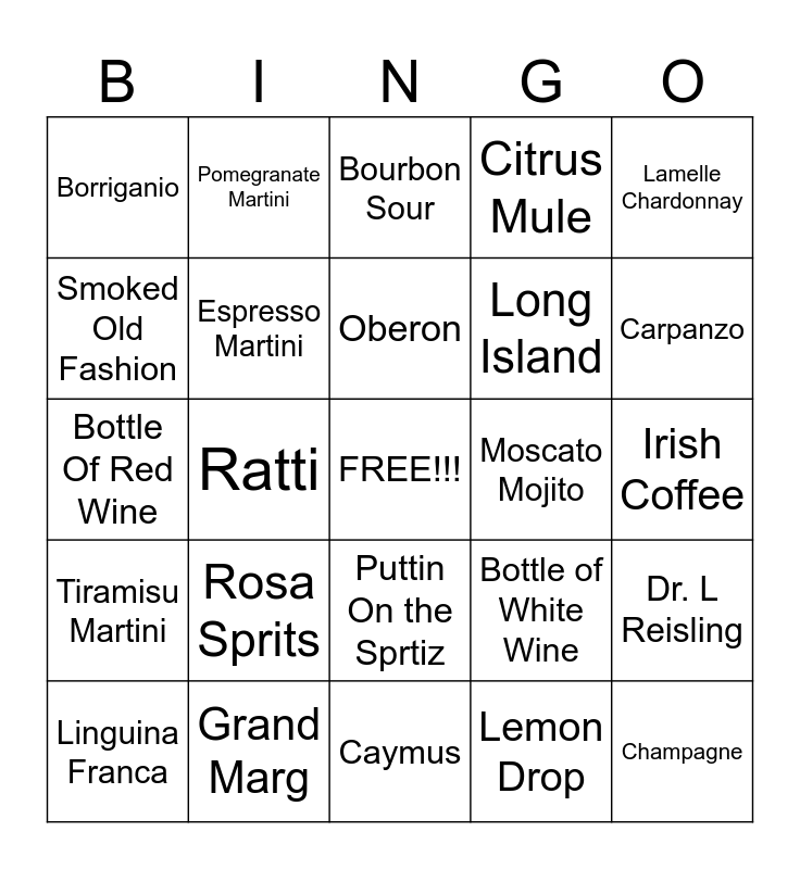 This bingo card has a free space and 24 words: Rosa Sprits, Grand Marg, Oberon, Linguina Franca, Lamelle Chardonnay, Borriganio, Smoked Old Fashion, Pomegranate Martini, Moscato Mojito, Puttin On the Sprtiz, Long Island, Bottle Of Red Wine, Bottle of White Wine, Dr. L Reisling, Espresso Martini, Lemon Drop, Irish Coffee, Bourbon Sour, Carpanzo, Ratti, Champagne, Tiramisu Martini, Citrus Mule and Caymus.