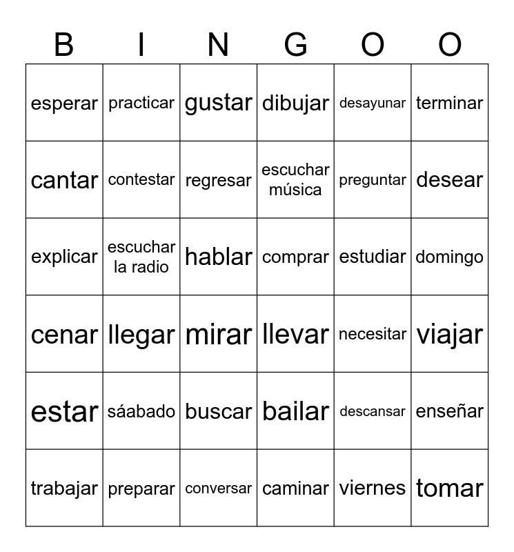 This bingo card has 36 words: bailar, buscar, caminar, cantar, cenar, comprar, contestar, conversar, desayunar, descansar, desear, dibujar, enseñar, escuchar la radio, escuchar música, esperar, estar, estudiar, explicar, gustar, hablar, llegar, llevar, mirar, necesitar, practicar, preguntar, preparar, regresar, terminar, tomar, trabajar, viajar, domingo, sáabado and viernes.