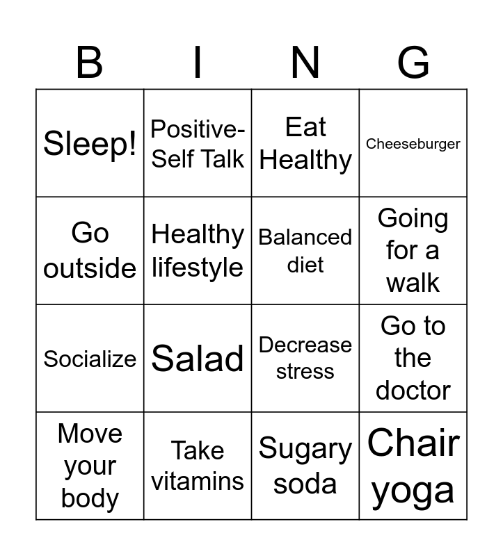 This bingo card has 20 words: Go to the doctor, Yoga, Eat Healthy, Drink Water, Move your body, Go outside, Take vitamins, Sleep!, Socialize, Positive-Self Talk, Salad, Decrease stress, Healthy lifestyle, Chair yoga, Balanced diet, Exercise, Going for a walk, Cheeseburger, Sugary soda and Chair yoga.