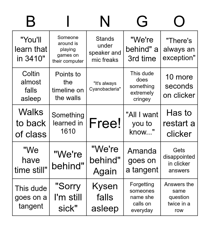 This bingo card has a free space and 24 words: "We're behind", "Sorry I'm still sick", "It's always Cyanobacteria", This dude goes on a tangent, "There's always an exception", "You'll learn that in 3410", Coltin almost falls asleep, Someone around is playing games on their computer, "All I want you to know...", "We're behind" Again, This dude does something extremely cringey, Walks to back of class, Amanda goes on a tangent, Gets disappointed in clicker answers, Points to the timeline on the walls, Forgetting someones name she calls on everyday, Has to restart a clicker, Stands under speaker and mic freaks, 10 more seconds on clicker, Something learned in 1610, Answers the same question twice in a row, "We have time still", "We're behind" a 3rd time and Kysen falls asleep.