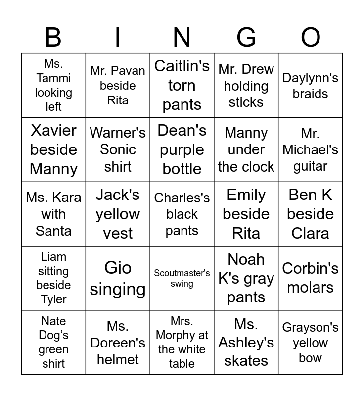 This bingo card has 45 words: Free!, Charles's black pants, Benjamin's red shirt, Nate Dog’s green shirt, Ms. Amanda under the exit sign, Ms. Ashley's skates, Caitlin's torn pants, Mr. Craig's crown, Daylynn's braids, Ms. Doreen's helmet, Mr. Drew holding sticks, Emily beside Rita, Scoutmaster's swing, Gio singing, Hannah's brown pants, Mrs. Morphy at the white table, Jaz's sunglasses, Ms. Kara with Santa, Lalana's shorts, Mr. Michael's guitar, Mr. Pavan beside Rita, Raedyn's glasses, Rhyse at the yellow table, Ms. Tammi looking left, Rachel-Ruth's purple hat, Ben K beside Clara, Judah beside Tyler, Lucas wearing green, Noah K's gray pants, Liam sitting beside Tyler, Reid's green crown, Corbin's molars, Rita on a pumpkin, Jessie's blue hoodie, Clara's Stitch shirt, Jack's yellow vest, Kaylee beside Sadie, Sadie's cards, Grayson's yellow bow, Dean's purple bottle, Xavier beside Manny, Manny under the clock, Amara at the blue table, Warner's Sonic shirt and Tyler's red glasses.