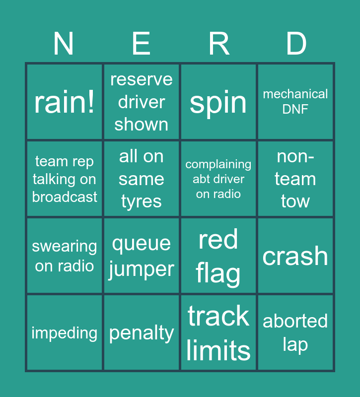 This bingo card has 16 words: penalty, crash, spin, rain!, swearing on radio, reserve driver shown, red flag, track limits, team rep talking on broadcast, all on same tyres, impeding, mechanical DNF, queue jumper, non-team tow, complaining abt driver on radio and aborted lap.