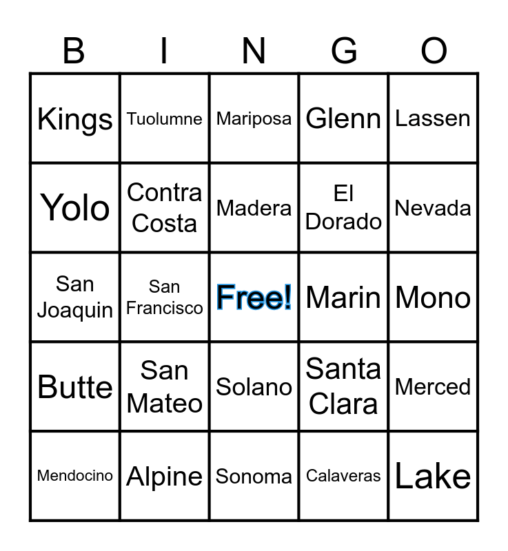 This bingo card has a free space and 58 words: Alameda, Alpine, Amador, Butte, Calaveras, Colusa, Contra Costa, Del Norte, El Dorado, Fresno, Glenn, Humboldt, Imperial, Inyo, Kern, Kings, Lake, Lassen, Los Angeles, Madera, Marin, Mariposa, Mendocino, Merced, Modoc, Mono, Monterey, Napa, Nevada, Orange, Placer, Plumas, Riverside, Sacramento, San Benito, San Bernardino, San Diego, San Francisco, San Joaquin, San Luis Obispo, San Mateo, Santa Barbara, Santa Clara, Santa Cruz, Shasta, Sierra, Siskiyou, Solano, Sonoma, Stanislaus, Sutter, Tehama, Trinity, Tulare, Tuolumne, Ventura, Yolo and Yuba.