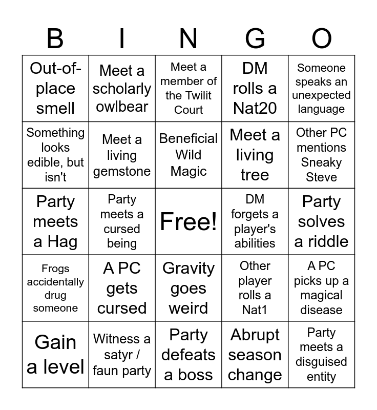 This bingo card has a free space and 24 words: A PC gets cursed, Witness a satyr / faun party, Beneficial Wild Magic, Gain a level, Someone speaks an unexpected language, Out-of-place smell, Something looks edible, but isn't, Meet a scholarly owlbear, DM forgets a player's abilities, Gravity goes weird, Meet a living tree, Party meets a Hag, Other player rolls a Nat1, A PC picks up a magical disease, Meet a living gemstone, Abrupt season change, Party solves a riddle, Meet a member of the Twilit Court, Other PC mentions Sneaky Steve, Party meets a cursed being, Party meets a disguised entity, Frogs accidentally drug someone, DM rolls a Nat20 and Party defeats a boss.