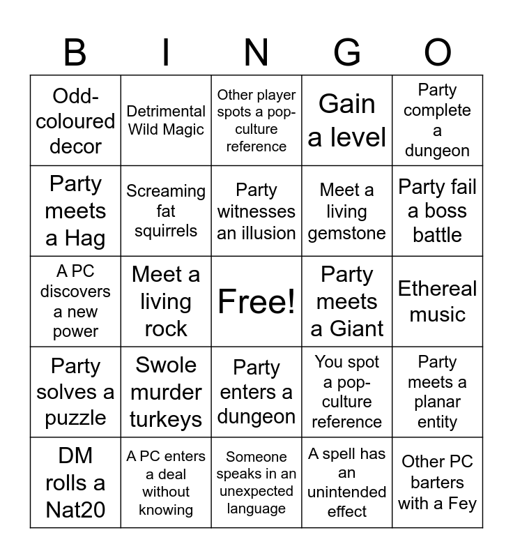 This bingo card has a free space and 24 words: Swole murder turkeys, A PC enters a deal without knowing, Party witnesses an illusion, DM rolls a Nat20, Party complete a dungeon, Odd-coloured decor, Party meets a Hag, Detrimental Wild Magic, Party meets a Giant, Party enters a dungeon, Meet a living gemstone, A PC discovers a new power, You spot a pop-culture reference, Party meets a planar entity, Screaming fat squirrels, A spell has an unintended effect, Ethereal music, Other player spots a pop-culture reference, Party fail a boss battle, Meet a living rock, Other PC barters with a Fey, Party solves a puzzle, Gain a level and Someone speaks in an unexpected language.