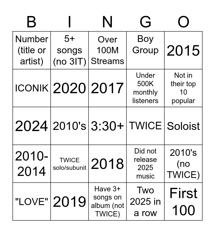 This bingo card has 40 words: 2025, 2024, 2023, 2020, 2019, 2018, 2017, 2016, 2015, 2010-2014, 2010's, Boy Group, 3:30+, Soloist, TWICE, TWICE solo/subunit, 3I, Number (title or artist), 1000+, Over 100M Streams, 2010's (no TWICE), Two 2025 in a row, Under 500K monthly listeners, ICONIK, 2025 Boy Group, Kickflip or 9MUSES, NMIXX or le sserafim, Under 2:45, First 100, Over 10M monthly listeners, 1-2 songs of artist on playlist, "LOVE", 3+ words, Did not release 2025 music, Not in their top 10 popular, Have 3+ songs on album (not TWICE), 3IT, Rookie (2024 debut or later), 5+ songs (no 3IT) and BABYMONSTER or STRAY KIDS.