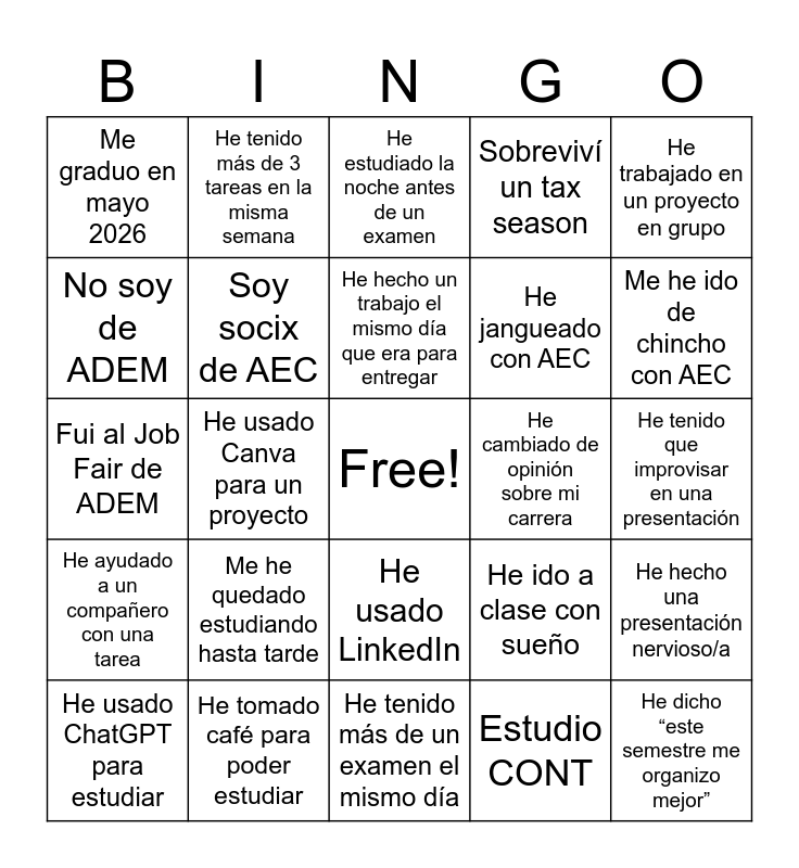 This bingo card has a free space and 24 words: Me he quedado estudiando hasta tarde, He tomado café para poder estudiar, He hecho un trabajo el mismo día que era para entregar, He usado ChatGPT para estudiar, He trabajado en un proyecto en grupo, Me graduo en mayo 2026, No soy de ADEM, He tenido más de 3 tareas en la misma semana, He cambiado de opinión sobre mi carrera, He usado LinkedIn, He jangueado con AEC, Fui al Job Fair de ADEM, He ido a clase con sueño, He hecho una presentación nervioso/a, Soy socix de AEC, Estudio CONT, He tenido que improvisar en una presentación, He estudiado la noche antes de un examen, Me he ido de chincho con AEC, He usado Canva para un proyecto, He dicho “este semestre me organizo mejor”, He ayudado a un compañero con una tarea, Sobreviví un tax season and He tenido más de un examen el mismo día.