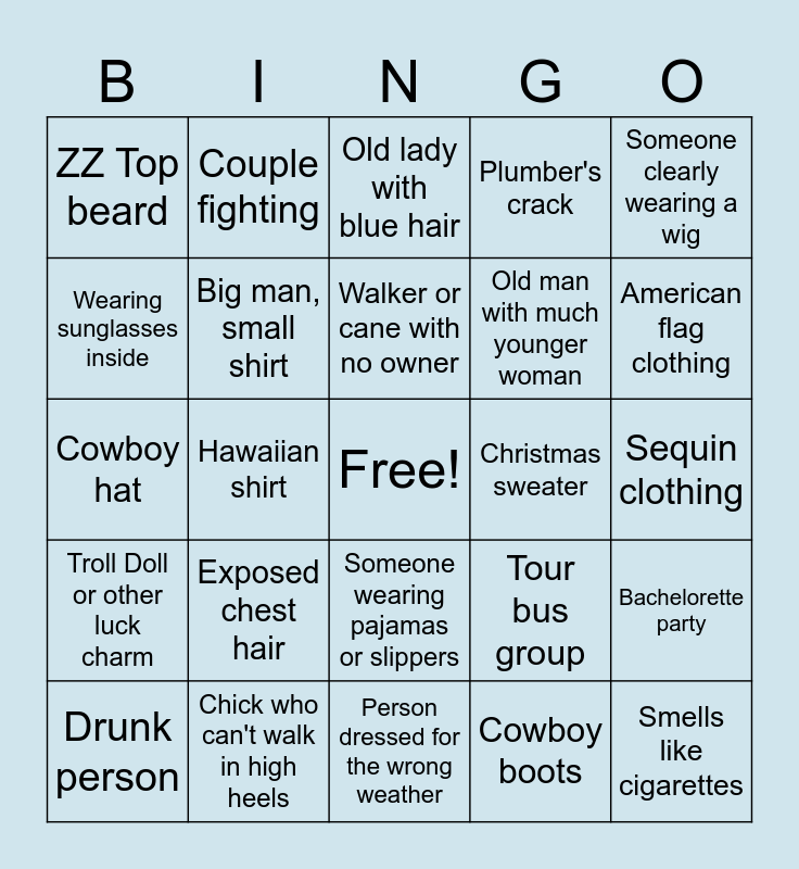 This bingo card has a free space and 24 words: Drunk person, Exposed chest hair, Walker or cane with no owner, Cowboy boots, Someone clearly wearing a wig, ZZ Top beard, Couple fighting, Old lady with blue hair, Christmas sweater, Sequin clothing, Cowboy hat, Big man, small shirt, Tour bus group, Bachelorette party, Wearing sunglasses inside, Chick who can't walk in high heels, Person dressed for the wrong weather, Plumber's crack, American flag clothing, Troll Doll or other luck charm, Hawaiian shirt, Someone wearing pajamas or slippers, Old man with much younger woman and Smells like cigarettes.