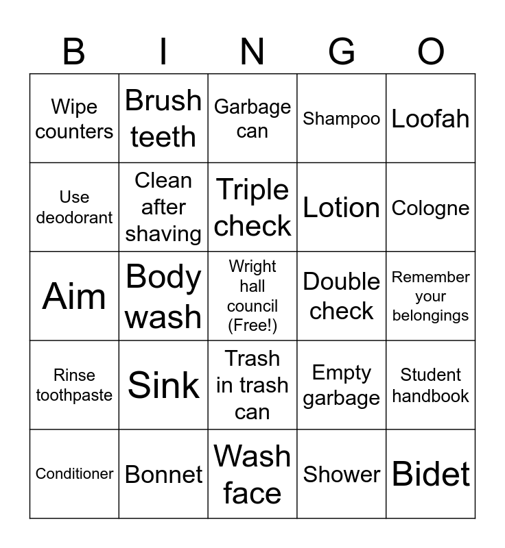 This bingo card has a free space and 73 words: Flush toilets, Wipe toilets, Wipe counters, Dry floors, Turn water off, Pick up trash, Rinse toothpaste, No food in sink, Empty garbage, Wash hands, Use shower shoes, Don’t clog toilets, Clean after shaving, Remember your belongings, Chaperone your guest, Brush teeth, Wash face, Use deodorant, Report repairs, Double check, Triple check, Shampoo, Loofah, Back scratchers, Conditioner, Soap, Robe, Comb, Hair brush, Towel, Bonnet, Exfoliator, Mouth wash, Floss, Body wash, Nail clippers, Nail file, Clean drains, Bidet, Bath, Shower, Sink, Menstrual products, Face wash, Moisturizer, Lotion, Garbage can, Bathroom, Sit down to pee, Aim, Respect neighbors, Bathroom Privacy, Lock the door, Respect the custodial staff, Don’t pee in showers, Toiletpaper, Shower caddy, Trash in trash can, Hair dryer, No smoking, Razer, Shaving, Custidial ≠ babysitter, Cologne, Perfume, Tissues, Mindfulness, Bath matt, Student handbook, Policy, Wright hall, Advocate and ready work.
