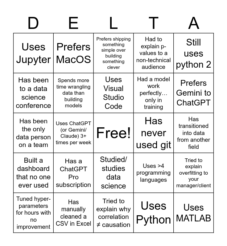 This bingo card has a free space and 46 words: Uses R, Uses MATLAB, Found out that your dataset has duplicate rows after analysis, Tried to explain why correlation ≠ causation, Has a ChatGPT Pro subscription, Thinks most AI-generated images look slightly off, Prefers MacOS, Thinks XGBoost is still king, Has been to a data science conference, Speaks >4 natural languages, Spends more time wrangling data than building models, Had to explain p-values to a non-technical audience, Tried to explain overfitting to your manager/client, Uses >4 programming languages, Prefers Tableau to PowerBI, Presented a model/dash-board, only to be asked for an Excel export, Uses Visual Studio Code, Has never used git, Someone asked you to “just add AI” to a project, Still uses python 2, Uses ChatGPT (or Gemini/ Claude) 3+ times per week, Uses Python, Uses Jupyter, Had a model work perfectly…only in training, Prefers pytorch to tensorflow, Prefers Gemini to ChatGPT, Tuned hyper-parameters for hours with no improvement, Knows Bayes theorem off the top of their head, Studied/ studies data science, Built a dashboard that no one ever used, Thought a project would take a week…it took three months, Believes feature engineering is more important than model selection, Wrote an entire function, only to discover there’s a library that does it better, Has used reinforcement learning, Has vibe coded something, Has manually cleaned a CSV in Excel, Has transitioned into data from another field, Has copied code from Stack Overflow, Has Googled their own error message word-for-word, Has hard-coded something “just for the demo”, Has been asked “is this AI?”, Prefers shipping something simple over building something clever, Has been the only data person on a team, Has worked remotely full-time, Has trained a model on a GPU and Has broken production.