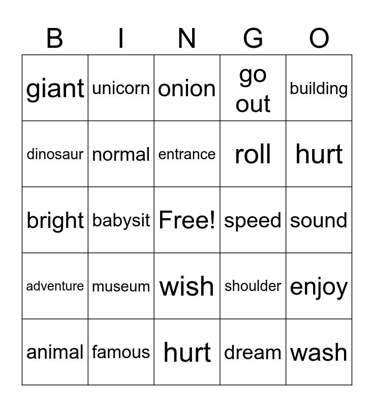 This bingo card has a free space and 24 words: museum, famous, entrance, animal, building, giant, dinosaur, unicorn, speed, wish, roll, bright, shoulder, enjoy, normal, dream, sound, onion, hurt, babysit, wash, adventure, go out and hurt.