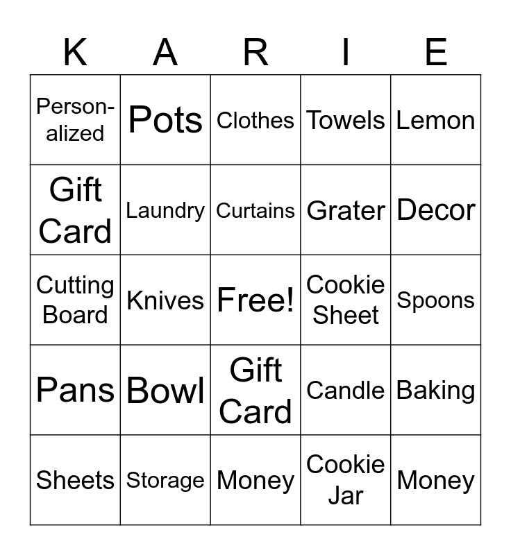 This bingo card has a free space and 27 words: Candle, Spatula, Grater, Money, Gift Card, Clothes, Pots, Pans, Cookie Sheet, Baking, Cutting Board, Towels, Sheets, Storage, Decor, Spices, Laundry, Curtains, Bowl, Person-alized, Spoons, Cookie Jar, Knives, Money, Gift Card, Lemon and Tools.