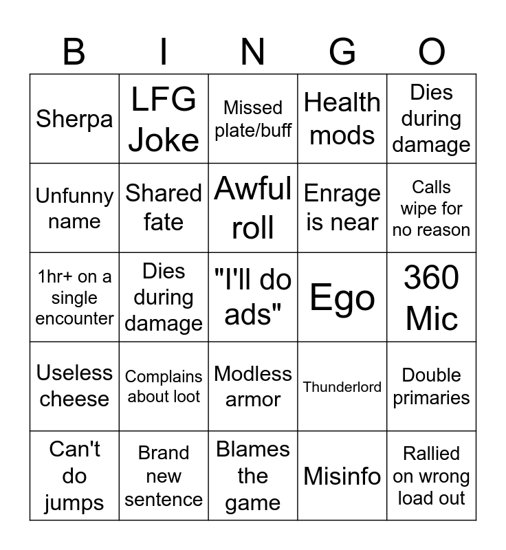 This bingo card has 25 words: Complains about loot, Blames the game, Awful roll, Can't do jumps, Dies during damage, Sherpa, Unfunny name, LFG Joke, Ego, Modless armor, Enrage is near, 1hr+ on a single encounter, Thunderlord, Double primaries, Shared fate, Rallied on wrong load out, 360 Mic, Missed plate/buff, Calls wipe for no reason, Dies during damage, "I'll do ads", Brand new sentence, Useless cheese, Health mods and Misinfo.