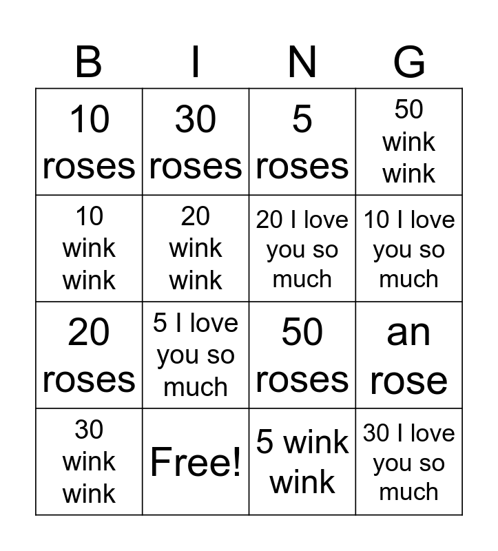 This bingo card has 16 words: Free!, an rose, 5 roses, 10 roses, 20 roses, 30 roses, 50 roses, 5 wink wink, 10 wink wink, 20 wink wink, 30 wink wink, 50 wink wink, 5 I love you so much, 10 I love you so much, 20 I love you so much and 30 I love you so much.