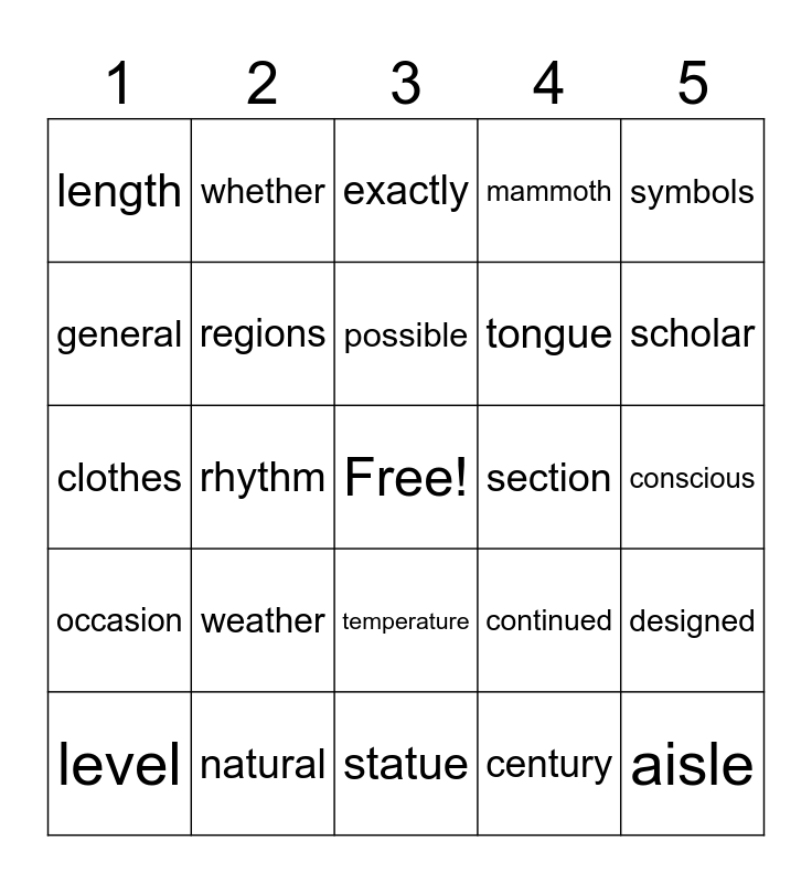 This bingo card has a free space and 24 words: level, weather, possible, century, symbols, length, whether, exactly, section, conscious, clothes, regions, continued, designed, general, natural, statue, mammoth, scholar, occasion, rhythm, temperature, tongue and aisle.