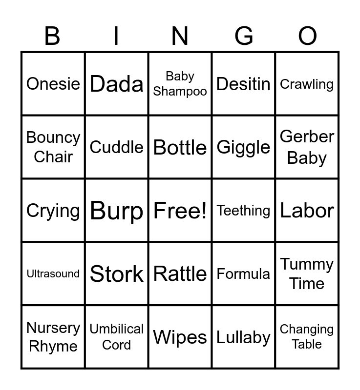 This bingo card has a free space and 75 words: Baby Oil, Baby Powder, Baby Shampoo, Baby Sitter, Bassinet, Bath Time, Bib, Blanket, Board Books, Bonnet, Booster Chair, Booties, Bottle, Bouncy Chair, Bundle of Joy, Burp, Car Seat, Changing Table, Clothes, Crawling, Crib, Crying, Cuddle, Dada, Desitin, Diaper Bag, Diaper Pail, Diaper Rash, Dimples, Drool, Due Date, Family, First Smile, Formula, Gerber Baby, Giggle, High Chair, Jaci, Labor, Lullaby, Mama, Mobile, Monitor, Nap Time, Nick, Night Light, Nursery Rhyme, Onesie, Pacifier, Playpen, Potty Training, Rattle, Ray, Registry, Rocking Chair, Rubber Duck, Shower, Sippy Cup, Sleep Sack, Spit up, Stork, Stroller, Stuffed Animal, Swaddle, Teddy Bear, Teething, Thermometer, Toes, Twinkle Twinkle Little Star, Tummy Time, Ultrasound, Umbilical Cord, Willie, Wipes and Toys.