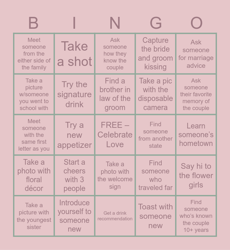This bingo card has a free space and 30 words: Introduce yourself to someone new, Take a selfie with 3 guests, Try a new appetizer, Compliment someone’s outfit, Meet someone from the either side of the family, Ask someone how they know the couple, Try the signature drink, Take a photo with the welcome sign, Find someone from another state, Get a drink recommendation, Learn someone’s hometown, Find someone who’s known the couple 10+ years, Toast with someone new, Take a group photo, Ask someone their favorite memory of the couple, Try two appetizers, Find someone who traveled far, Take a photo with floral décor, Start a cheers with 3 people, Ask someone for marriage advice, Meet someone with the same first letter as you, Ask someone how they met their partner, Take a shot, Take a pic with the disposable camera, Take a picture w/someone you went to school with, Capture the bride and groom kissing, Say hi to the flower girls, Take a picture with the youngest sister, Find a brother in law of the groom and Share your favorite.