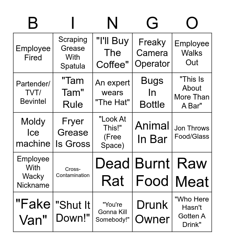 This bingo card has a free space and 24 words: Cross-Contamination, "Shut It Down!", An expert wears "The Hat", "Fake Van", Employee Walks Out, Employee Fired, Partender/ TVT/ Bevintel, Scraping Grease With Spatula, Animal In Bar, Dead Rat, Bugs In Bottle, Moldy Ice machine, Burnt Food, Raw Meat, "Tam Tam" Rule, Drunk Owner, Jon Throws Food/Glass, "I'll Buy The Coffee", "This Is About More Than A Bar", Fryer Grease Is Gross, "Who Here Hasn't Gotten A Drink", Employee With Wacky Nickname, Freaky Camera Operator and "You're Gonna Kill Somebody!".