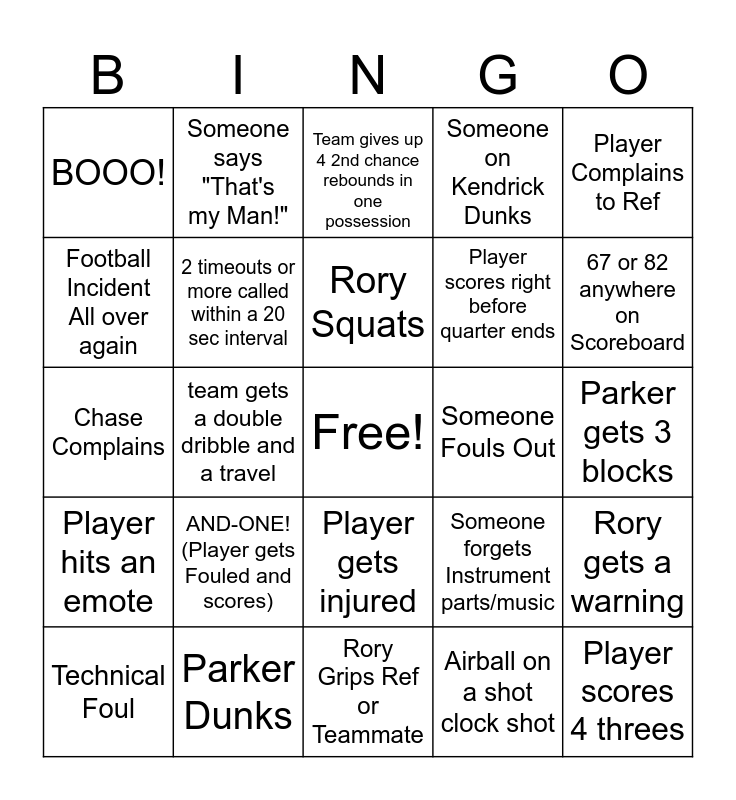 This bingo card has a free space and 24 words: AND-ONE! (Player gets Fouled and scores), Parker Dunks, Rory Squats, Technical Foul, Player Complains to Ref, BOOO!, Football Incident All over again, Someone says "That's my Man!", Someone Fouls Out, Player gets injured, Player scores right before quarter ends, Chase Complains, Someone forgets Instrument parts/music, Rory gets a warning, 2 timeouts or more called within a 20 sec interval, Airball on a shot clock shot, Parker gets 3 blocks, Team gives up 4 2nd chance rebounds in one possession, 67 or 82 anywhere on Scoreboard, team gets a double dribble and a travel, Player scores 4 threes, Player hits an emote, Someone on Kendrick Dunks and Rory Grips Ref or Teammate.