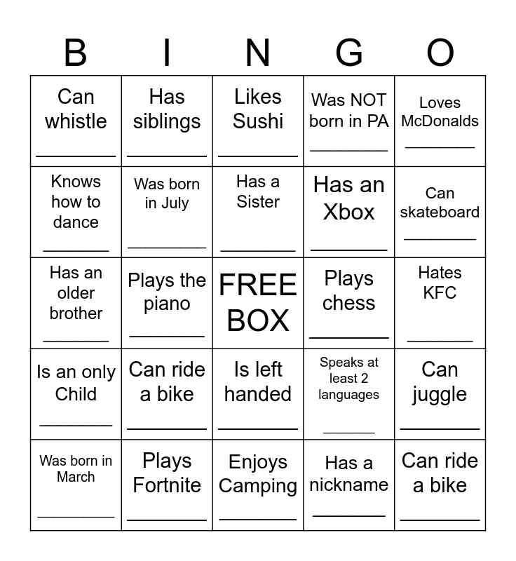 This bingo card has a free space and 32 words: Has a nickname _______, Is wearing jeans ________, Plays the piano _______, Has a Dog _______, Is an only Child _______, Was born in July _________, Loves McDonalds ________, Can juggle _______, Has siblings _______, Hates Pizza _______, Has a Sister ________, Likes Sushi _______, Plays a sport at school ________, Can whistle _______, Plays chess _______, Was NOT born in Australia ________, Was born in March __________, Has an older brother _______, Is left handed _______, Can ride a bike _______, Speaks at least 2 languages _______, Plays chess _______, Hates KFC _______, Plays Fortnite _______, Can ride a bike _______, Was NOT born in PA ________, Has an Xbox ______, Knows how to dance _______, Can whistle _______, Enjoys Camping _______, Has a nickname _______ and Can skateboard ________.